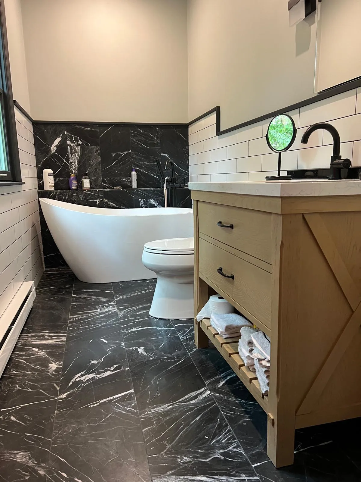 Matte black waterfall faucet with a wide spout, perfect for contemporary vanities.